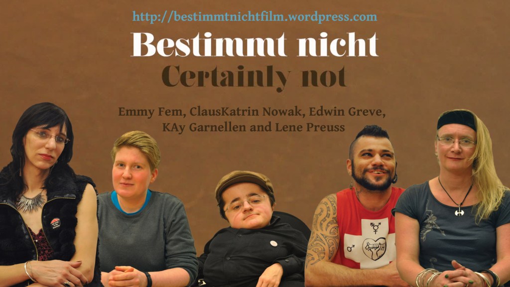 bestimmt nicht is an educational video adressing public misconceptions about transgenderism. It is a collaboration project with the activist and academic Resa-Philip Lunau. bestimmt nicht is funded by TransInterQueer (TrIQ) e.V.
